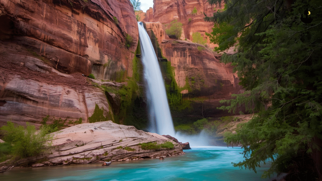• A breathtaking blue-green waterfall hidden deep within the Grand Canyon.